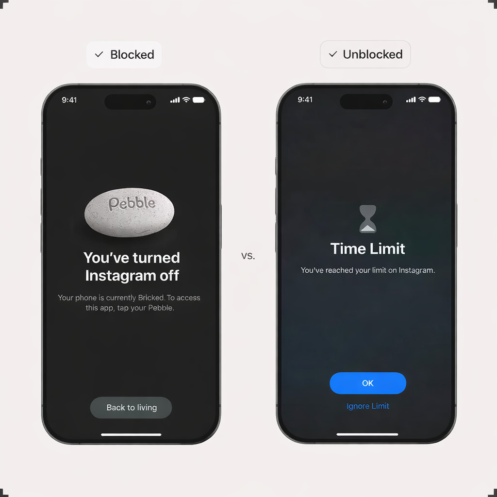 Screen Time and Digital Wellbeing limits are easy to bypass — tap 'skip' and you're back in. Brick creates physical separation, requiring a rescan to exit, which reinforces intention and keeps temptation out of reach.